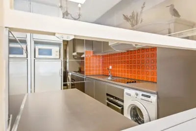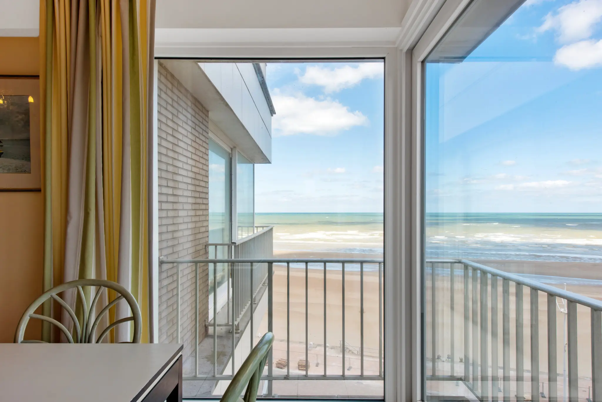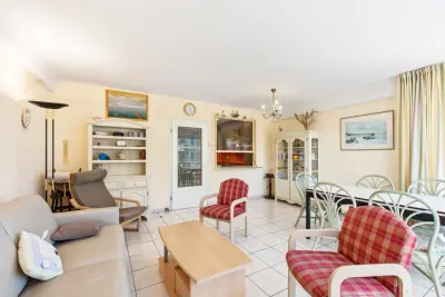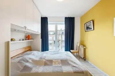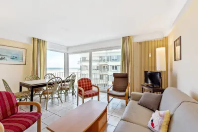 Appartement agréable au 5ème étage pour 6 personnes (max 8). Belle vue sur la mer. Une chambre avec lit 2 personnes et lavabo, une chambre avec lits gigognes soit 2 lits simples, une petite chambre aveugle avec lits superposés pour 2 pers., un sofa lit 2 pers. au living.