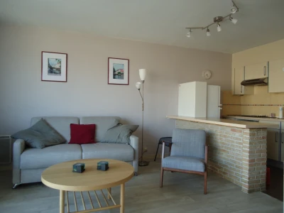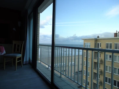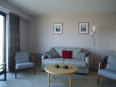 Appartement une chambre avec vue latérale sur la mer, à 20 m de la plage, 5ème étage, living spacieux avec divan-lit, cuisine ouverte équipée, chambre avec vue sur mer, lit 2 personnes, salle de bain avec douche, wc séparré.
