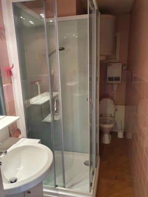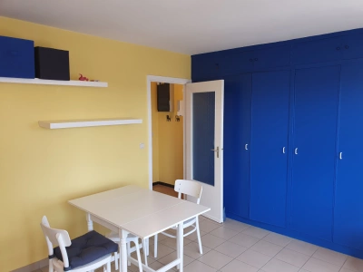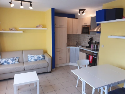 Studio confortable avec vue sur la mer au coin de la digue de mer à Oostduinkerke - Bad. Aménagement : séjour lumineux avec cuisine ouverte, salle de bains avec douche, toilettes et lavabo simple. Canapé-lit pour 2 personnes et 2 lits simples intégrés dans le salon.