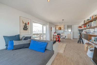 Cet appartement de vacances situé sur la digue d'Ostende offre un design unique et une terrasse panoramique avec une vue magnifique sur la mer et la ville. Cet appartement d'angle dispose d'un hall d'entrée, d'un salon avec cuisine ouverte, d'un canapé-lit permettant de dormir avec vue sur la mer, d'un débarras, d'une salle de douche et d'une chambre avec lit double et placard intégré. De plus, une machine à laver est disponible pour plus de commodité. Profitez du luxe et du confort dans un emplacement de choix.