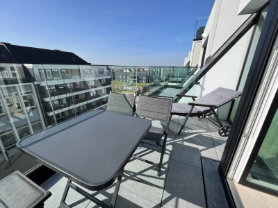 Appartement moderne, dans le centre et pas loin de la digue. Composition : séjour avec cuisine ouverte, chambre séparée, salle de bain avec douche, toilette séparée et terrasse ensoleillée. Equipé pour 4 personnes.