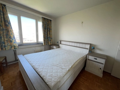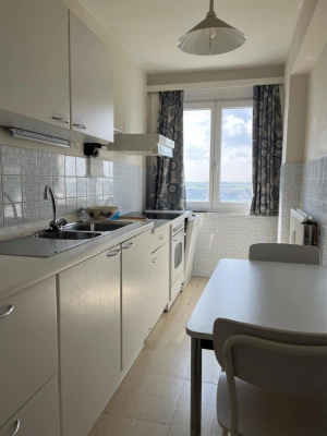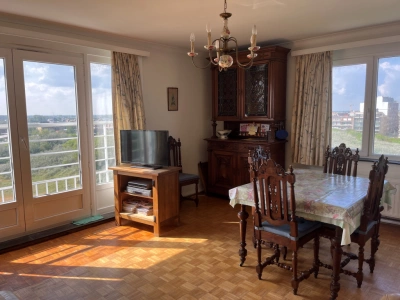 Appartement d'angle avec vue mer latérale, vue sur les dunes et l'arrière-pays de Middelkerke. Situé près du centre de Middelkerke. Composition : séjour, cuisine séparée avec tout le nécessaire, WC séparé, salle de bain avec baignoire, chambre avec lit double et chambre avec 2 lits simples. Equipé pour 4 personnes.