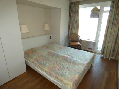 Appartement spacieux avec vue sur mer et les dunes. Composition: living avec terrasse, cuisine, salle de bain avec baignoire, douche et 3 chambres à coucher. Prévu pour 6 personnes.