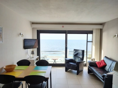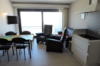 Studio moderne avec vue frontale sur la mer. Composition: séjour avec lit armoire, coin à dormir avec lits superposés, terrasse, cuisine ouverte, salle de bain avec douche et toilette. Cave privative pour 2 vélos incluse. Prévu pour 4 personnes.