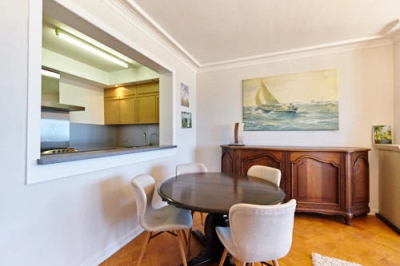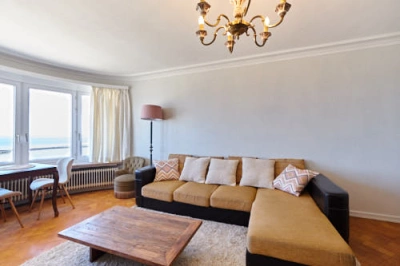 Bel appartement situé sur la promenade entre le Monument des Marins et le Casino, au 9ème étage se composant d'un grand living avec vue splendide sur la mer, TV digitale et WIFI, cuisine rénovée séparée avec lave-vaisselle, nouvelle salle de bains avec douche, lavabo, toilettes et machine à laver, toilettes séparées, deux grandes chambres à larrière avec balcon (1 lit double et 2 lits jumeaux).