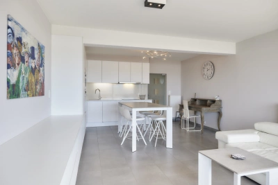 Très bel appartement rénové situé sur le Zeedijk à Mariakerke, rez-de-chaussée comprenant : salon avec vue unique sur la mer, TV numérique et WIFI, cuisine ouverte équipée d'un lave-vaisselle, débarras avec lave-linge et sèche-linge, 2 chambres avec lit double. Dans le couloir, il y a deux autres lits pliants simples. Chaque chambre dispose de sa propre salle de bains. Une salle de bains avec baignoire, l'autre avec douche à l'italienne. Les deux chambres donnent accès à l'agréable jardin intérieur. Les fumeurs et les animaux domestiques ne sont pas autorisés.