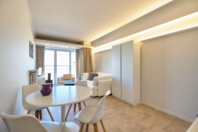 Studio rénové et moderne sur la promenade piétonnière, au 2ème étage : beau living avec vue splendide sur la mer, TV digitale, WIFI, divan-lit pour 2 personnes, cuisine ouverte, coin à dormir avec un lit double et salle de bains avec baignoire/douche, lavabo et toilettes.