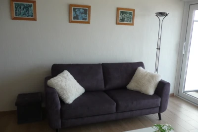 Bovengrondse garage aan de achterzijde van dit appartement (diepte: 540, breedte 273) voorzien van elektr en licht!.. . Lift, woonkamer voorzien van laminaat, digibox. flatscreen, internet. telenet - gratis wifi. Keukentafel is rond en kan vergroot worden naar ovaal . Comfortabele open keuken: koelkast + vriezer, vaatwasser, koffiezetapparaat, Senseo, waterkoker, blender, elektrische kookgerei, combimagnetron; stofzuiger, ; bergkast in gang apart toilet; badkamer met wastafel, kast in douche; 1 slaapkamer met tweepersoonsbed; ook rolluik; 2e slaapkamer met stapelbed met 1 persoons- en tweepersoonsbed; wasrek voor aan balkon,