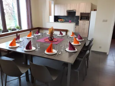 Maison de vacances avec cuisine équipée avec toute la vaisselle et couverts, salon avec poêle à bois vitré, TV, lecteur DVD, 6 chambres à coucher, 7 SDB, 5 toilettes, kicker, jeux de palets, sauna infrarouge, parking privé. Jardin avec balançoire, toboggan, bbq, terrasse.