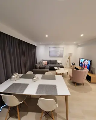 L’appartement comprend un spacieux séjour avec cuisine entièrement équipée, une chambre avec lit King Size donnant sur la terrasse, une deuxième chambre avec lits superposés, ainsi qu’une salle de bain avec WC. La terrasse ensoleillée offre un endroit agréable pour se détendre.