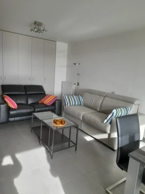 Salon spacieux avec salle à manger et cuisine entièrement équipée, salle de rangement avec machine à laver et petit congélateur,
