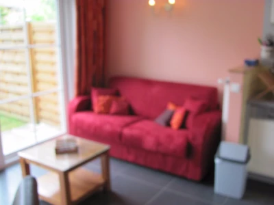 Living avec canapé-lit convertible pour 2 personnes (couchage qualité hôtel) et avec cuisine ouverte équipée d'un frigo avec freezer, micro-ondes, four, cuisson au gaz, lave-vaisselle, petit électro-ménager et toute la vaisselle nécessaire.
