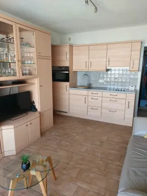 -Le studio, très fonctionnel et cosy, est équipé d'un grand meuble living avec un lit pour deux personnes, vitrine et penderie, TV numérique avec toutes chaînes (francophones et néerlandophones) et DVD.