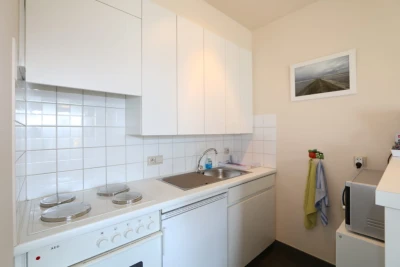 - La cuisine est équipée d’un poêle électrique (4 points d’ébullition), d’un four à micro-ondes, d’un four et d’un réfrigérateur.