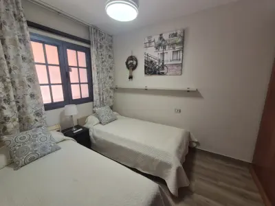 TENERIFE SUD, dans une résidence sécurisée, appartement de 2 chambres (70 m2), une salle de bain, cuisine équipée, salon séjour, TV SAMSUNG SMART TV, wifi gratuit, coffre-fort, alarme, terrasse aménagée de 12 m2 avec store et volet roulant. (4 personnes maxi, non-fumeurs).