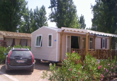 Mobile home pour 6 personnes, avec deux chambres, living/cuisine, salle de bain et WC. Terrasse couverte, télévision, climatisation réversible, frigo et micro-ondes ,climatisation réversible et emplacement de stationnement devant le Mobil-home.