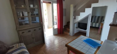 - Rez-de-chaussée : séjour avec cuisine équipée, chambre avec lit double, salle d'eau, WC séparé, terrasse vue mer.