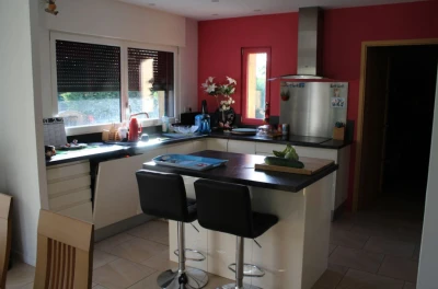 Rez-de-chaussée : salle à manger, salon, cuisine équipée, WC, lave-vaisselle, lave-linge si besoin, téléviseur, WiFi.