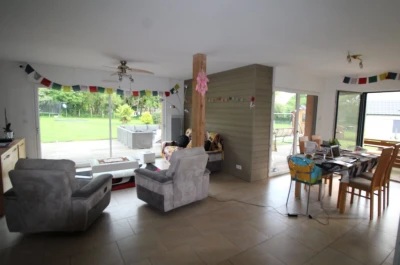 Maison de charme ossature bois 2014, tout confort, grandes baies vitrées, en bordure de forêt, clôturée, parking privé sous carport, calme assuré, beau terrain avec piscine couverte et sécurisée, plancha.