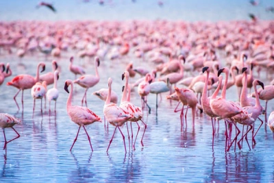 De taille plus réduite que le précédent mais plus connu, le lac Nakuru, à deux heures de route au nord de Naivasha, doit sa réputation aux flamants roses qui l’occupent durant la saison des pluies, entre avril et juin. Ce sont alors des milliers d’échassiers qui viennent profiter des hautes eaux et du festin promis.