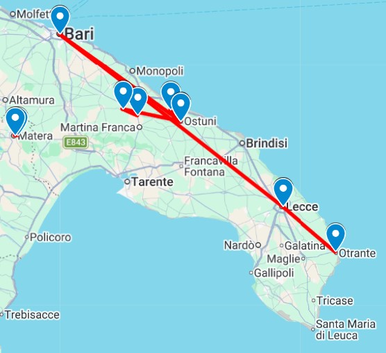 Au départ de la charmante ville de Lecce, joyau baroque des Pouilles, notre itinéraire vous mène jusqu’à la lumineuse Ostuni, la célèbre « ville blanche », en passant par l’incontournable Matera et ses habitations troglodytiques uniques. Ce parcours vous plonge au cœur d’une région authentique, entre villages immaculés, oliveraies centenaires et littoral scintillant bordé par la mer Adriatique.