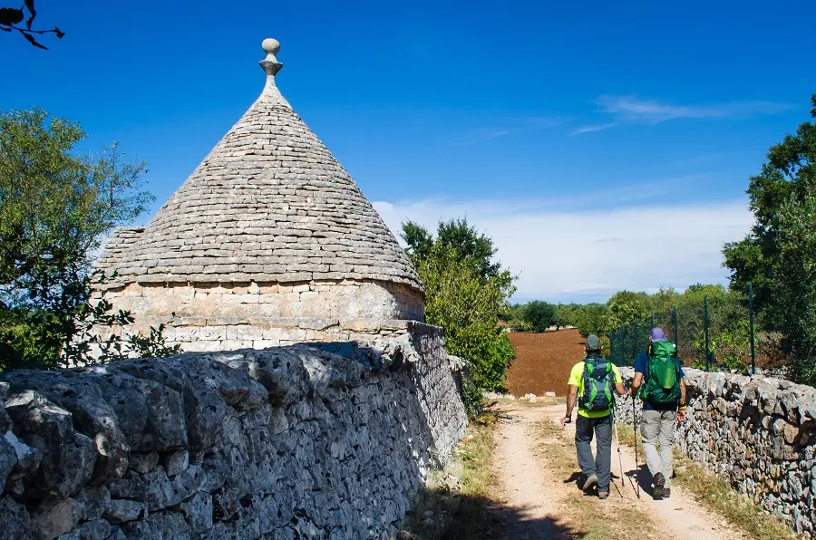 Après notre petit déjeuner, transfert privé (environ 1 heure) vers la vallée d’Itria. Au programme du jour, une randonnée le long de la « Greenway » de l’aqueduc des Pouilles, le plus long d’Europe. Arrivée à Locorotondo, village caractérisé par ses ruelles concentriques et ses maisons typiques appelées « cummerse ». Nous prenons un train pendant 15 minutes pour rejoindre Alberobello. Installation et nuit dans des « trulli », habitations traditionnelles des Pouilles . Dîner et nuit.